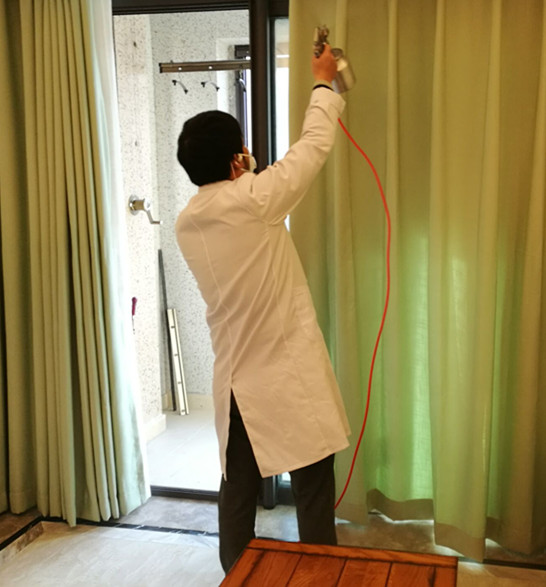 使用藥劑及施工方案: 主要藥劑有甲醛消除劑、納米光觸媒。根據(jù)這套房子室內(nèi)裝修情況,對于集中定做的柜子和抽屜,我公司施工人員使用甲醛清除劑對柜子和抽屜進(jìn)行全面噴灑,重點(diǎn)治理,施工時(shí)保證全面均勻、不留死角,另外對墻面和沙發(fā),坐墊窗簾等布飾使用光觸媒治理,在分解污染源的同時(shí),增加光觸媒的受面,能分解游離的甲醛其他污染物,下面為施工現(xiàn)場照片:
